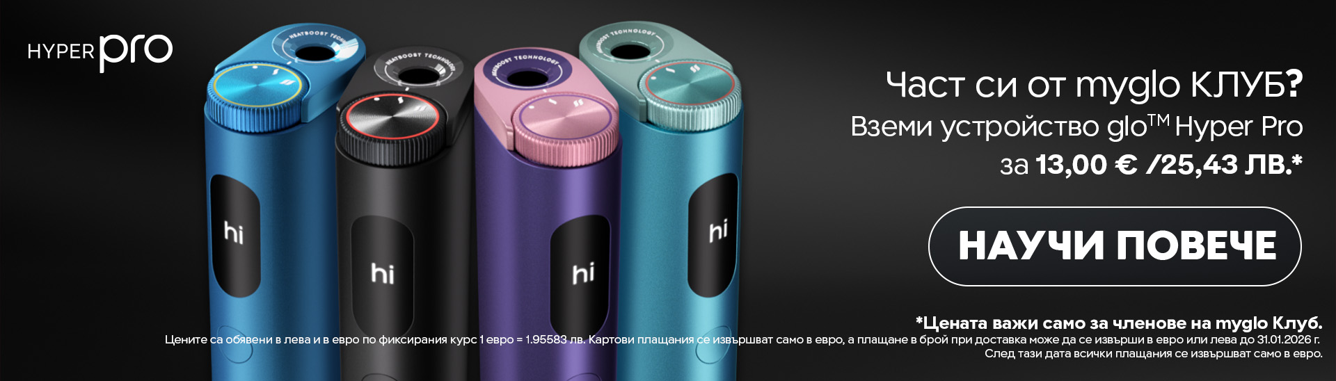 23,00 € / 44,98 лв. Цена с myglo Клуб* 13,00 € / 25,43 лв.Цена за членове на myglo Клуб и е валидна ако имаш регистрация на myglo, независимо дали имаш регистрирано glo™ HYPER Pro към профила до този моментКартови плащания се извършват само в евро, а плащане в брой при доставка може да се извърши в евро или лева до 31.01.2026 г. След тази дата всички плащания се извършват само в евро.