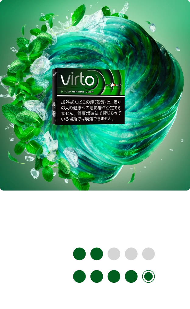 ※ 吸いごたえ、冷涼感、フレーバー感の指標は、弊社商品開発部所属の複数名の従業員による、実際の喫煙体験への評価に基づきます。吸い方や個人により、感じ方に差がある場合があります。
