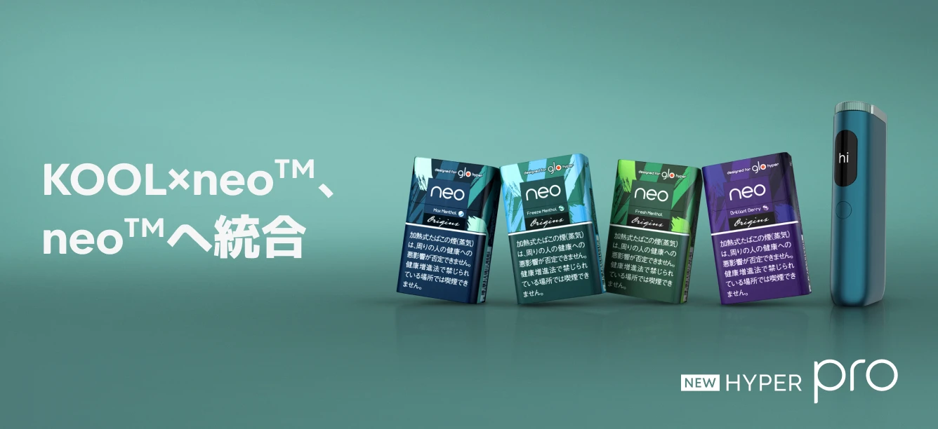 BATジャパン(本社:東京都港区赤坂、社長:エマ・ディーン、正式社名:ブリティッシュ・アメリカン・タバコ・ジャパン合同会社)は、加熱式たばこデバイス「glo™(グロー)」専用たばこスティックブランドの一つである「KOOL x neo™(クール・エックス・ネオ)」の2銘柄(以下表内)について3月25日(月)※1より在庫なくなり次第販売終了とし、これに伴いglo™用「KOOL x neo™」ブランドは終了となります。今後、「KOOL x neo™」は「neo™(ネオ)」ブランドに統合されます。