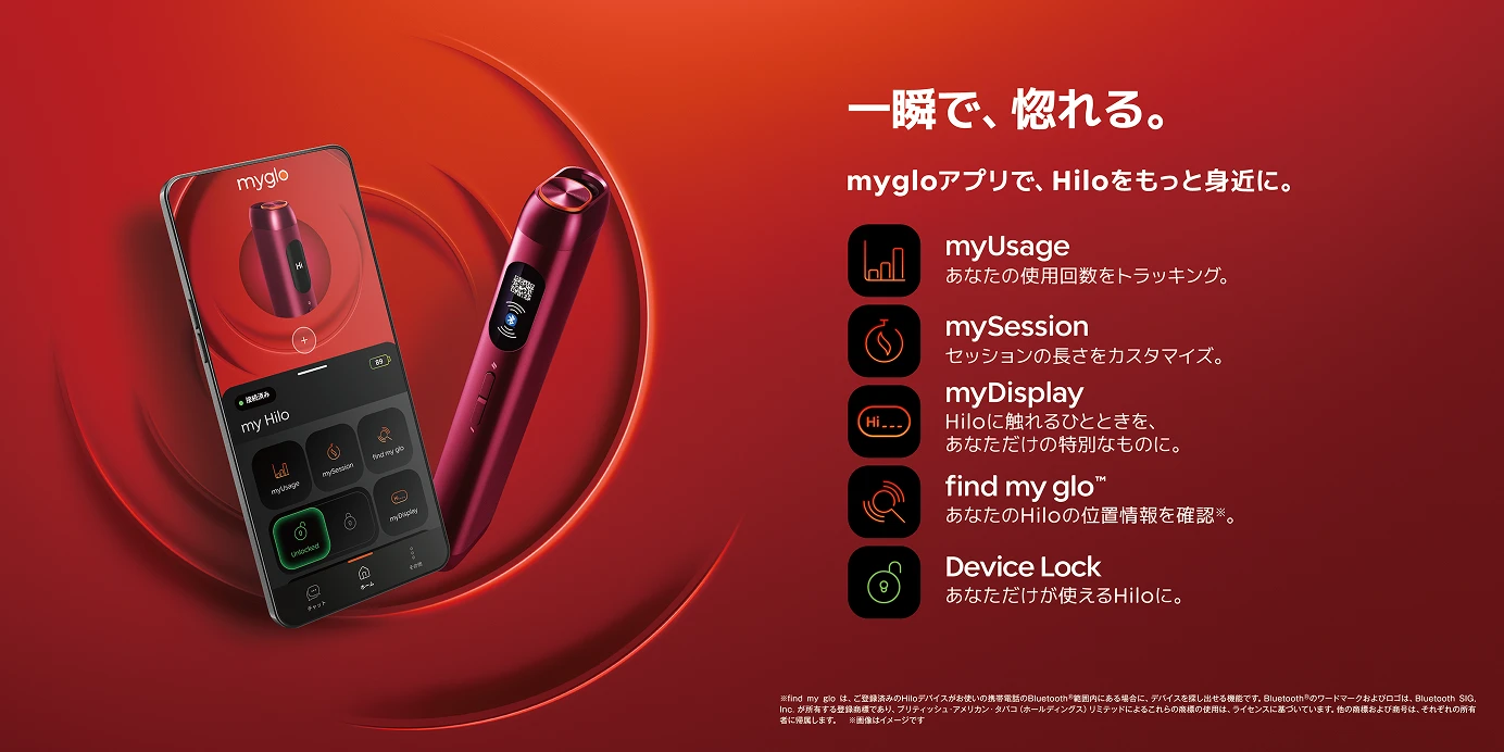 ※1 find my gloは、ご登録済のHiloデバイスがお使いの携帯電話のBluetooth®の範囲内にある場合に、デバイスを探し出せる機能です。Bluetooth®のワードマーク及びロゴは、Bluetooh SIG, Inc.が所有する商標登録であり、ブリティッシュ・アメリカン・タバコ(ホールディングス)リミテッドによるこれらの商標の使用は、ライセンスに基づいています。他の商標及び商号は、それぞれの所有者に帰属します。